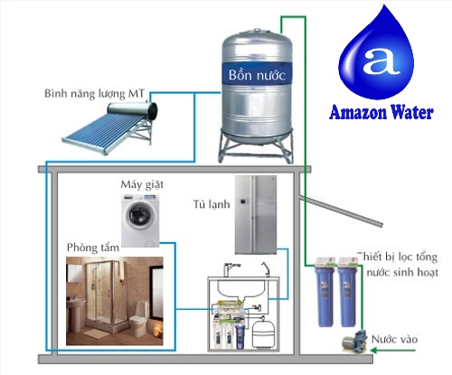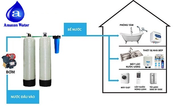 - Cấp lọc thô: Công suất từ 300-2000 l/h (tùy thuộc vào số lượng thành viên trong gia đình) gồm các cột lọc loại bỏ cặn bẩn , nâng pH, loại bỏ kim loại nặng, mùi hôi tanh, chống gây cáu cặn trong đường ống thiết bị. Nước sau lọc phụ vuc mục đích tắm, rửa, giặt giũ, lau nhà. (chi tiết)